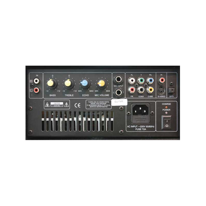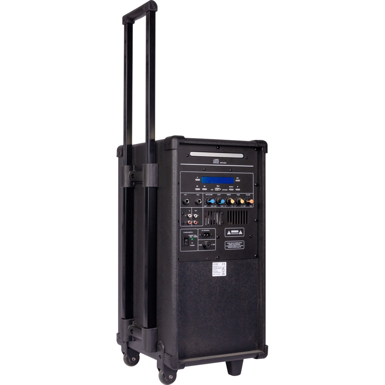 Aktief 2-Wege-System met 8″” / 20cm Subwoofer en 3″” / 7,5cm Hoog- en middentoon. 40W RMS en 160W max vermogen Duidelijk geluid. CD-Player die zowel gewone als Mp3 cd’s afspeeld. USB ingang voor het afspelen van MP3 bestanden vanaf een USB stick. Ingebouwde accu voor als er geen netstroom aanwezig is. Microfoon volume regelbaar tevens echo functie (ook regelbaar) Afmetingen 26 x 53 x 30cm Gewicht: 12,1kg